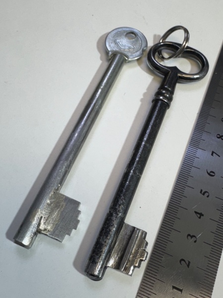 Диаметр стержня ключа - 7 мм, толщина бородки более 4 мм. В замке 4 толстые сувальды, поэтому, как и оригинальный ключ, дубликат был изготовлен из стали посредством пайки прутка и пластины, пайка производилась твердым припоем с высоким содержанием серебра, что значительно повышает прочность скрепляемых элементов. Такой ключ прослужит не одно десятилетие.