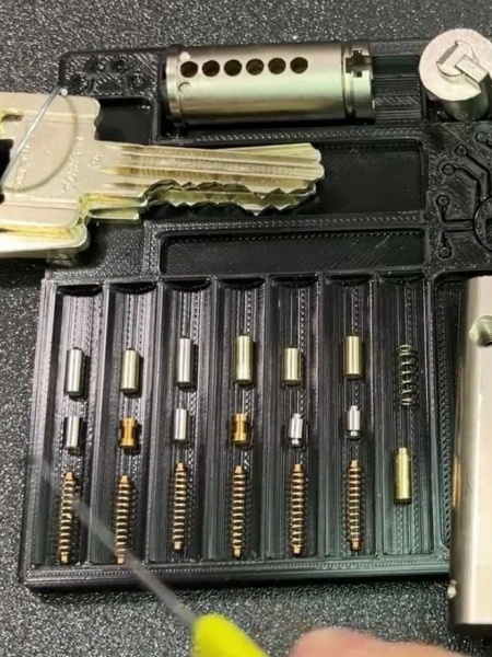 Механизм имеет 6 пар штифтов, драйвер пины разной формы для защиты от манипуляций отмычками, имеется защита от высверливания