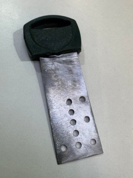 Сложность изготовления этого ключа заключалась в том, что оригинальных ключей на этот вид домофонной панели не было, мы нашли размеры ключа, расположение перфораций на пластине, затем нарезали ключ из прочной стальной пластины, клиент сам прописал ключ в панель и вуаля, все работает!