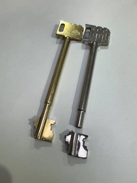 Оригинал ключа был сломан у самого основания бородок, так как изготовлен из силумина, это сплав алюминия и кремния, очень хрупкий материал, кроме того, ключ был довольно старый и кодовые элементы были изношены. Мы сделали ключ из латуни - более износостойкого и пластичного материала, также вернули ключ к номинальным размерам, которые были изначально. Ключ получился с первого раза, в замке прокручивается без закусываний.