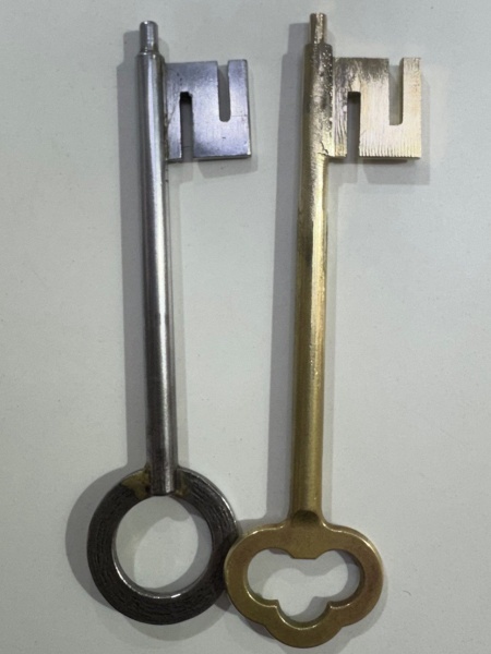 Ключ довольно большой и заготовок к нему нет, поэтому мы спаяли латунные части и нарезали секретность. Прорези на ключе имеют свою функцию и сделаны не просто для красоты. Ключ, вращаясь в замке, проходит через выступы в корпусе замка. Если вырезы ключа совпадают с ними, то замок открывается — это, по сути, примитивная механическая секретность, которая была изобретена еще в античности